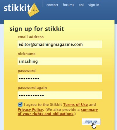 Stikkit網(wǎng)站的用戶體驗就做的非常好,它幾乎不要求用戶提供任何信息,給用戶一種寬松愉悅的感覺。 這不正是網(wǎng)頁設(shè)計師希望用戶體驗的感覺嗎?