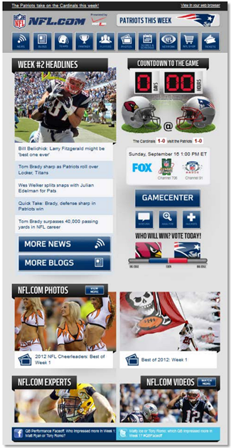 從NFL.com中發(fā)現(xiàn),營銷與為用戶創(chuàng)造快樂也可以如此融洽,讓用戶在樂趣中使用一個品牌,不知不覺中用戶已成為你的忠誠fans。而郵件超越大眾傳播的一個優(yōu)勢在于,它具有互動功能,并可以實時更新你的創(chuàng)意。
