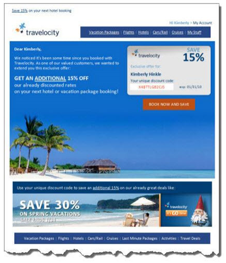 Travelocity 在用戶召回郵件營銷活動中的創(chuàng)意表現(xiàn)突出。它們的設(shè)計師們創(chuàng)建了如此漂亮的郵件,讓許久不曾回來的用戶只想沉浸于美景其中,在流連忘返中重新成為活躍用戶。這封郵件創(chuàng)意帶來的投資回報率增幅超過100%。
