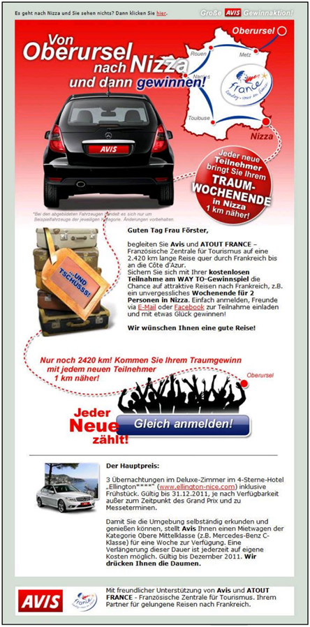 Avis Germany和ATOUT FRANCE(法國旅游發(fā)展署)邀請用戶參與一個現(xiàn)實的從德國到法國的公路之旅。若要從城鎮(zhèn)到另一個城鎮(zhèn),用戶必須招募新的成員來幫助自己。本次大賽獎品包括前往所有五個目標的城鎮(zhèn)的旅行。活動后,Avis Germany、ATOUT FRANCE的用戶列表分別增長2%、4%。